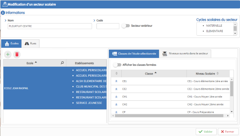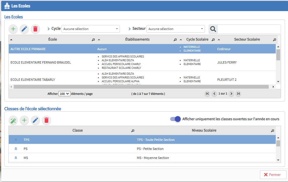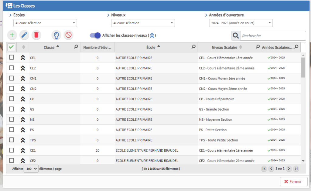 Le système vous donne la possibilité de paramétrer les écoles, les classes (y compris multi-niveaux) et les fiches des enseignants.