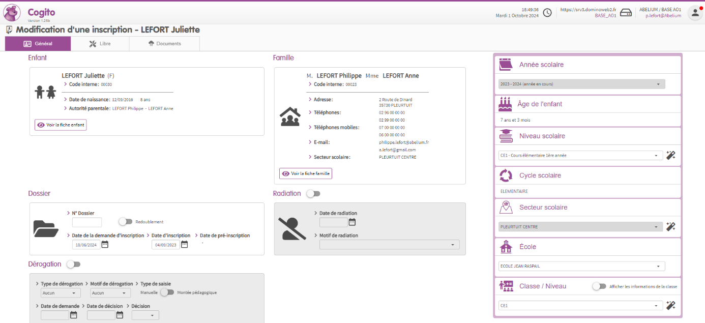 L’école, la classe et le niveau scolaire de l’enfant se renseignent automatiquement par rapport à l’adresse et à l’âge de l’enfant.