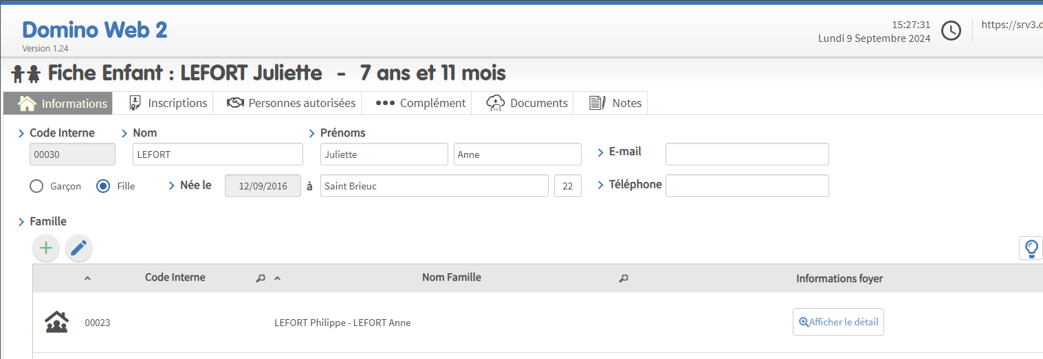 Saisissez UNE SEULE FOIS les informations famille et enfant.