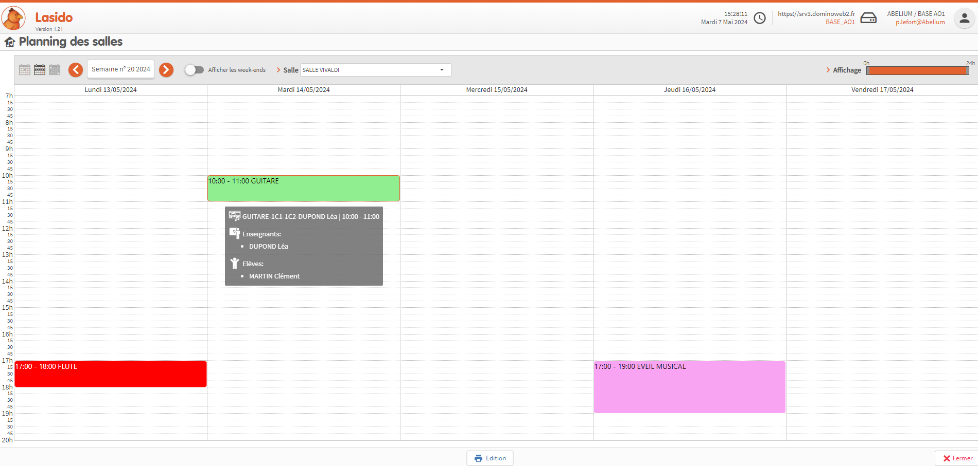 Le fonctionnement d’une école de musique est indissociable du planning des salles. Lasido propose des agendas ergonomiques pour connaitre les dates et heures de cours ainsi que le descriptif des équipements et de la capacité des pièces.